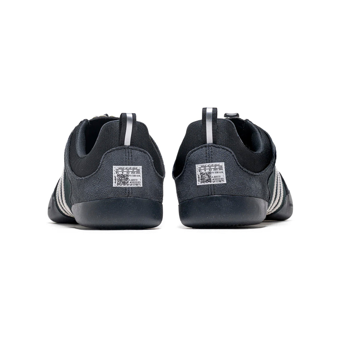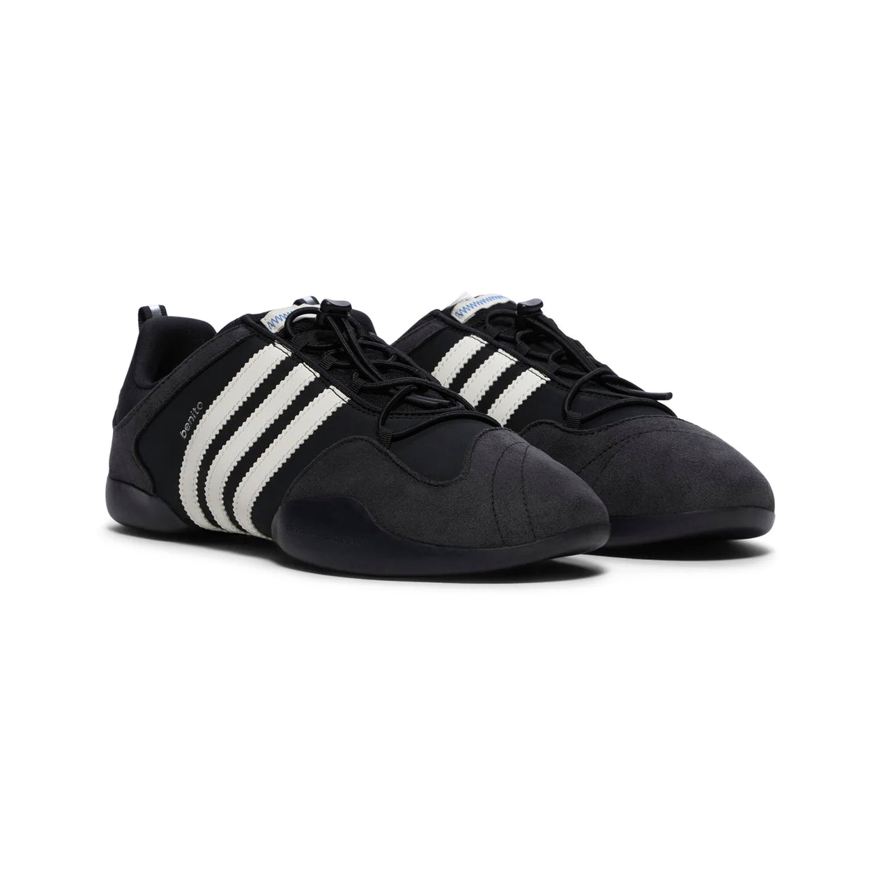 The Bad Bunny x adidas Ballerina 'Black Chalk' debuts a slim and flat-soled silhouette based on the adidas Taekwondo. Secured with a drawcord lacing system, the black nylon upper features tonal suede overlays and off-white three-stripes. 'Benito' is stamped on the lateral side, while the back heel displays an exposed size tag. Blue contrast stitching atop the tongue recalls Bad Bunny's Gazelle Indoor. Underfoot, a split rubber outsole provides a combination of flexibility and grippy traction.