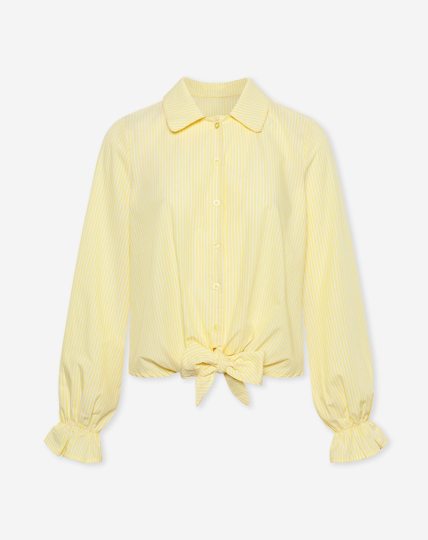 De blouse is gemaakt van een geel met wit gestreepte stof en heeft een strik aan de voorkant. Combineer de blouse met de matchende short voor een trendy co-ord look!