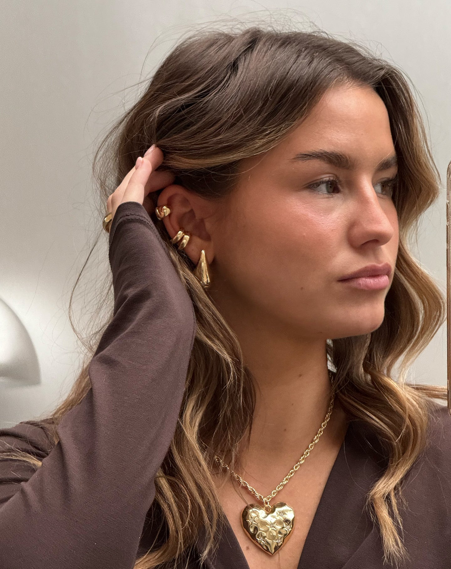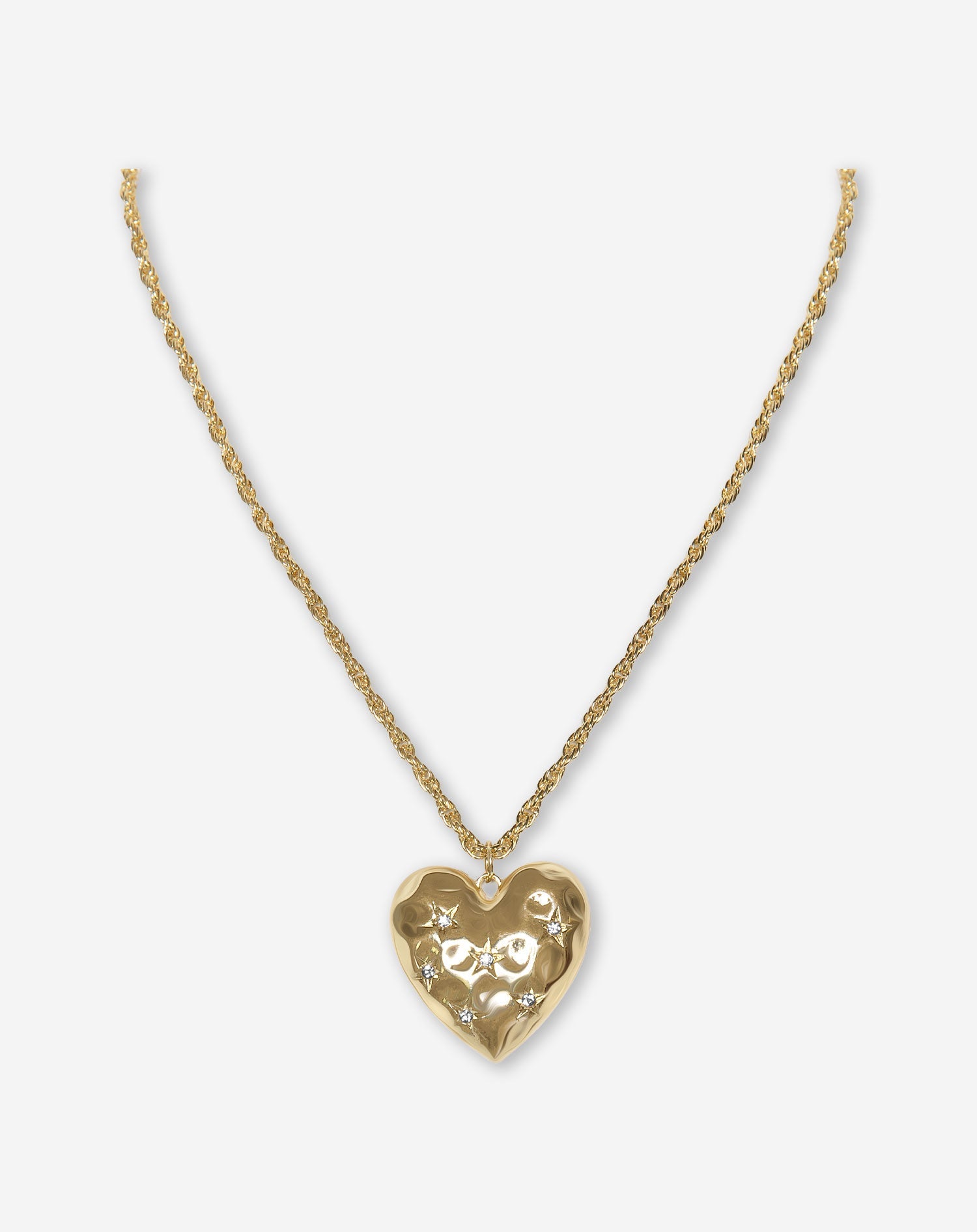 De ketting is goudkleurig en is verstelbaar. De ketting heeft een groot, gouden hart met daarin kleine sterretjes met zilveren diamantjes.