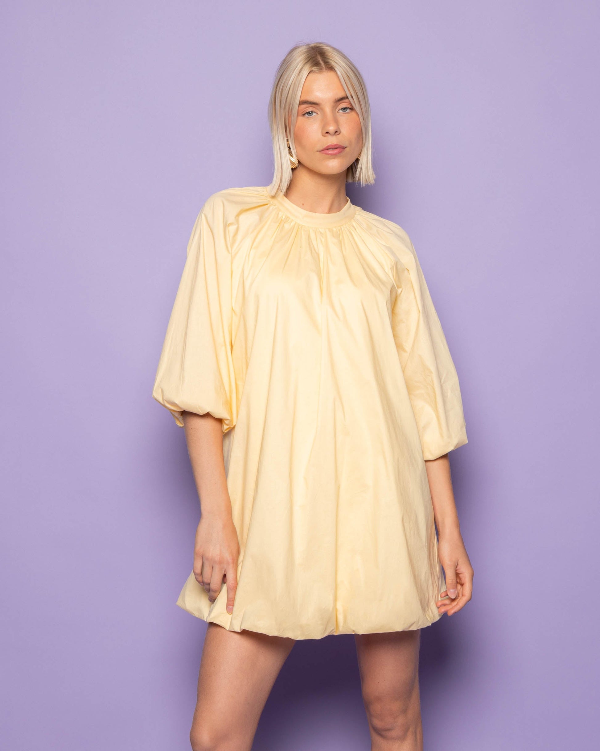 De jurk is gemaakt van een botergele, katoenen stof. De jurk heeft een knoopsluiting in de nek en is puffy aan de onderkant.
