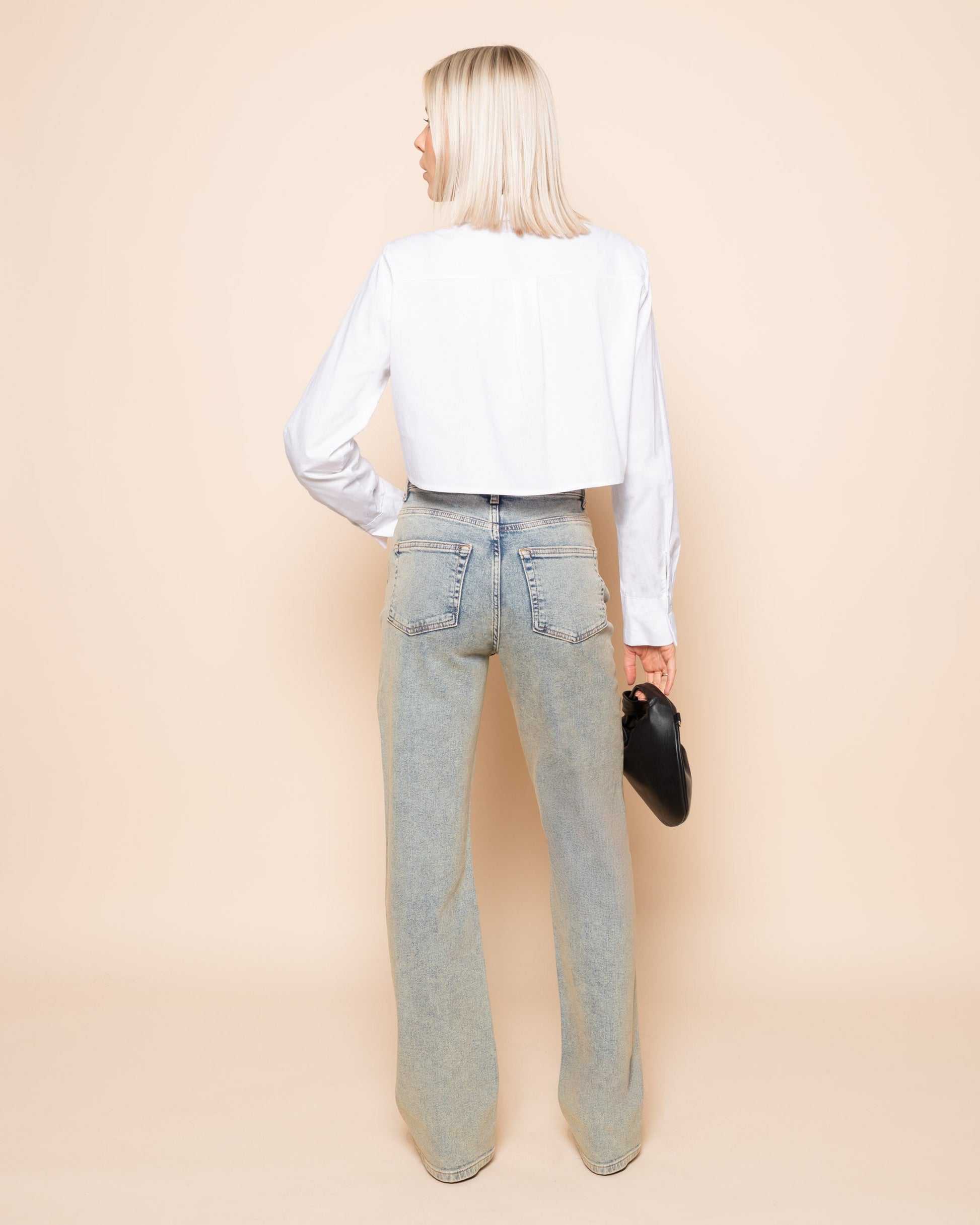 De jeans is gemaakt van een blauwe, vintage denim stof. De jeans heeft zakken aan de voor- en achterkant en heeft een bootcut model. De broek bevat stretch waardoor deze goed aansluit.