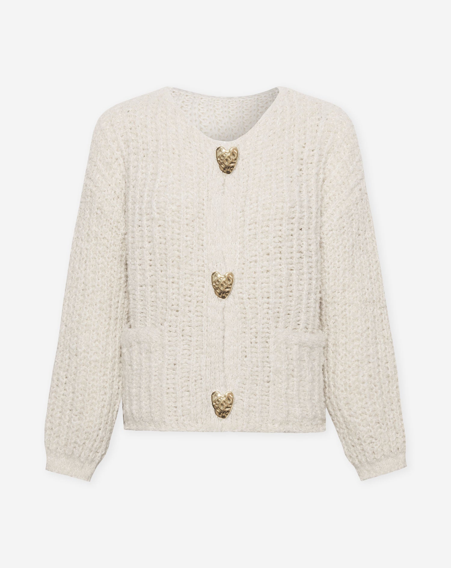 De cardigan is gemaakt van een dikkere, crème-kleurige stof. De cardigan heeft een ronde hals en heeft mooie, gedetailleerde hart-vormige knopen.