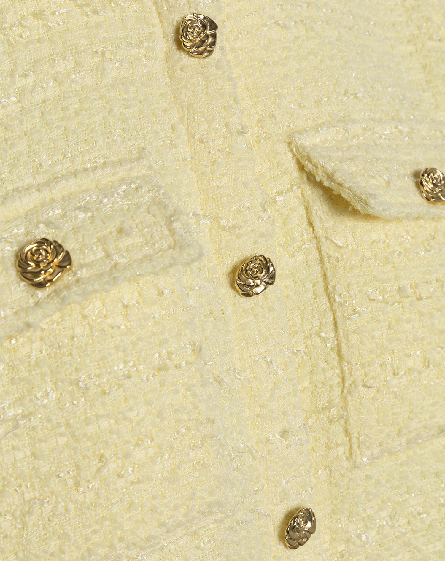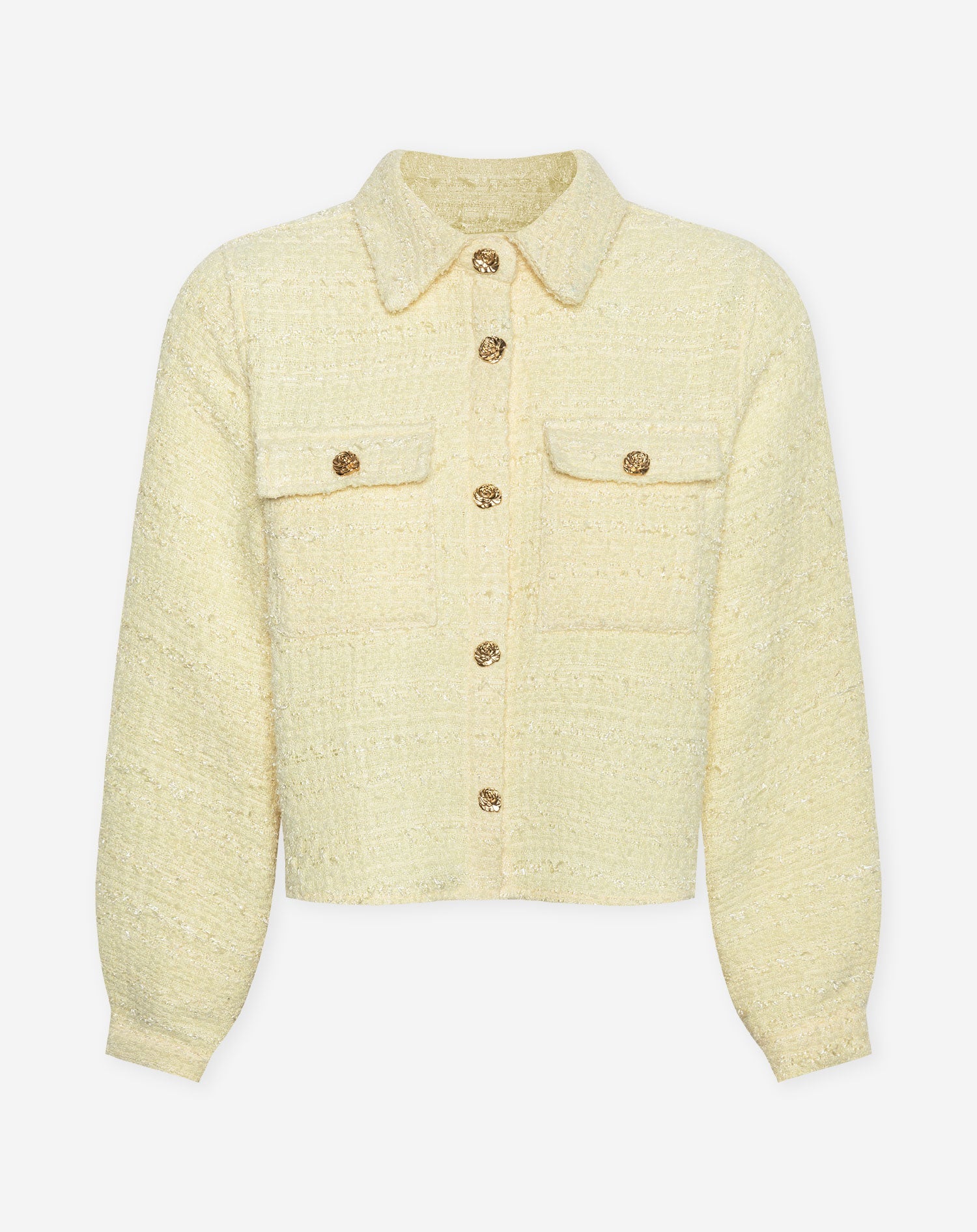 Het jasje is gemaakt van een botergele, boucle stof met lurex glitters er doorheen. Het jasje heeft een knoopsluiting en een cropped fit. Combineer het jasje met de bijpassende shorts voor een trendy look.