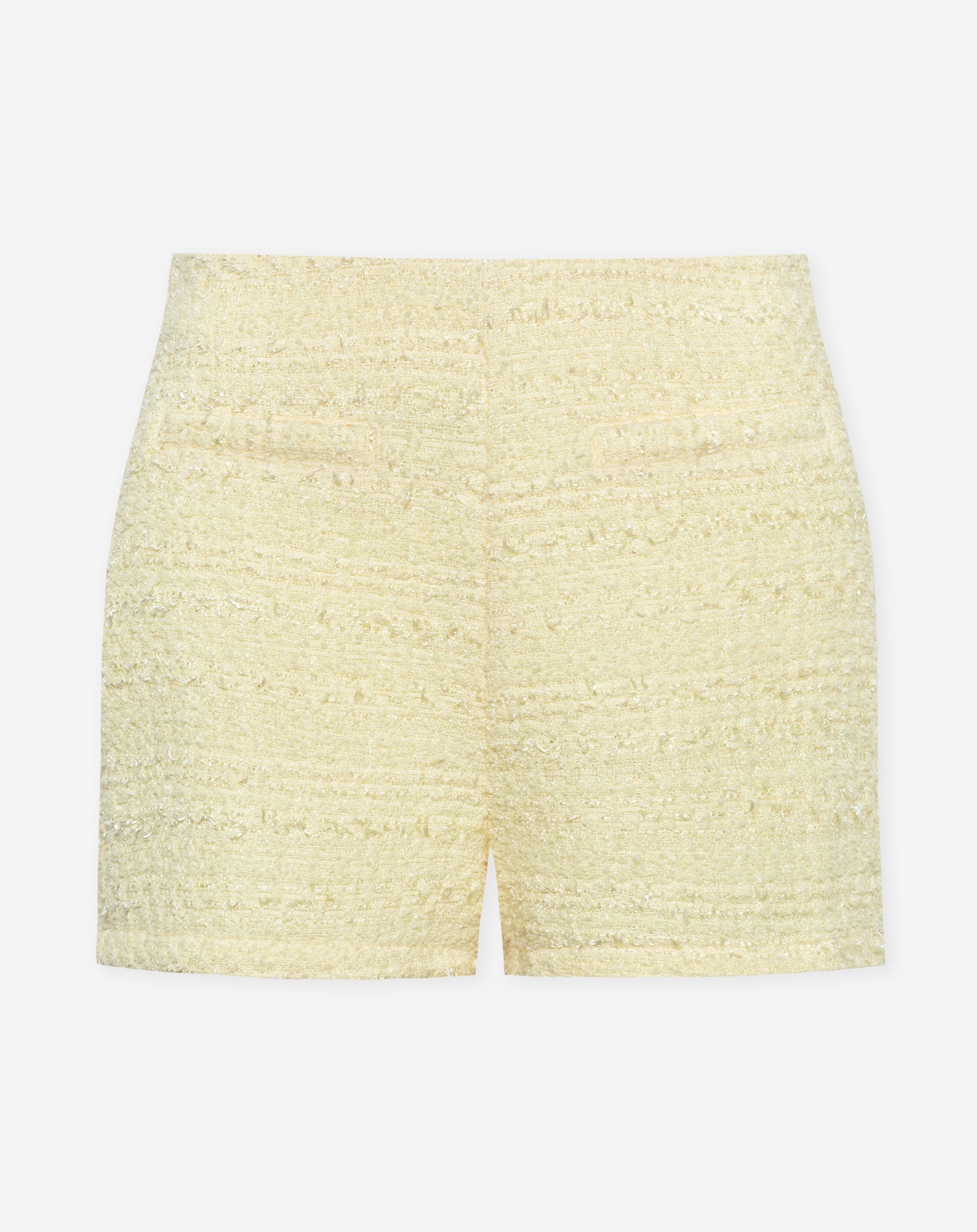 De short is gemaakt van een botergele, boucle stof met lurex glitter er doorheen. De short heeft een ritssluiting. Combineer de short met de bijpassende Boucle Lurex Cropped Jacket voor een trendy look.