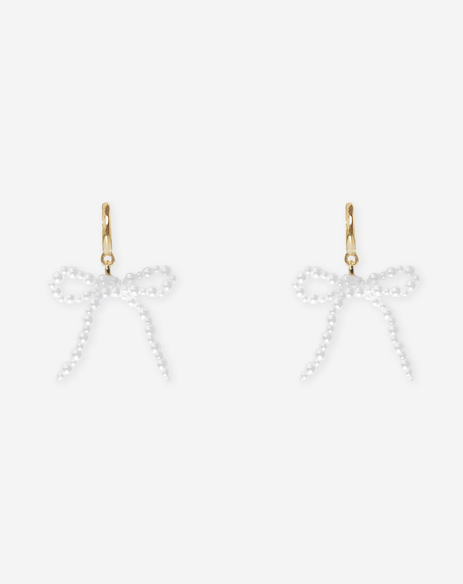Deze oorbellen maken jouw look helemaal af! De oorbellen hebben een gouden hoop aan de bovenkant en hebben een strikvormige hanger met kleine pareltjes.