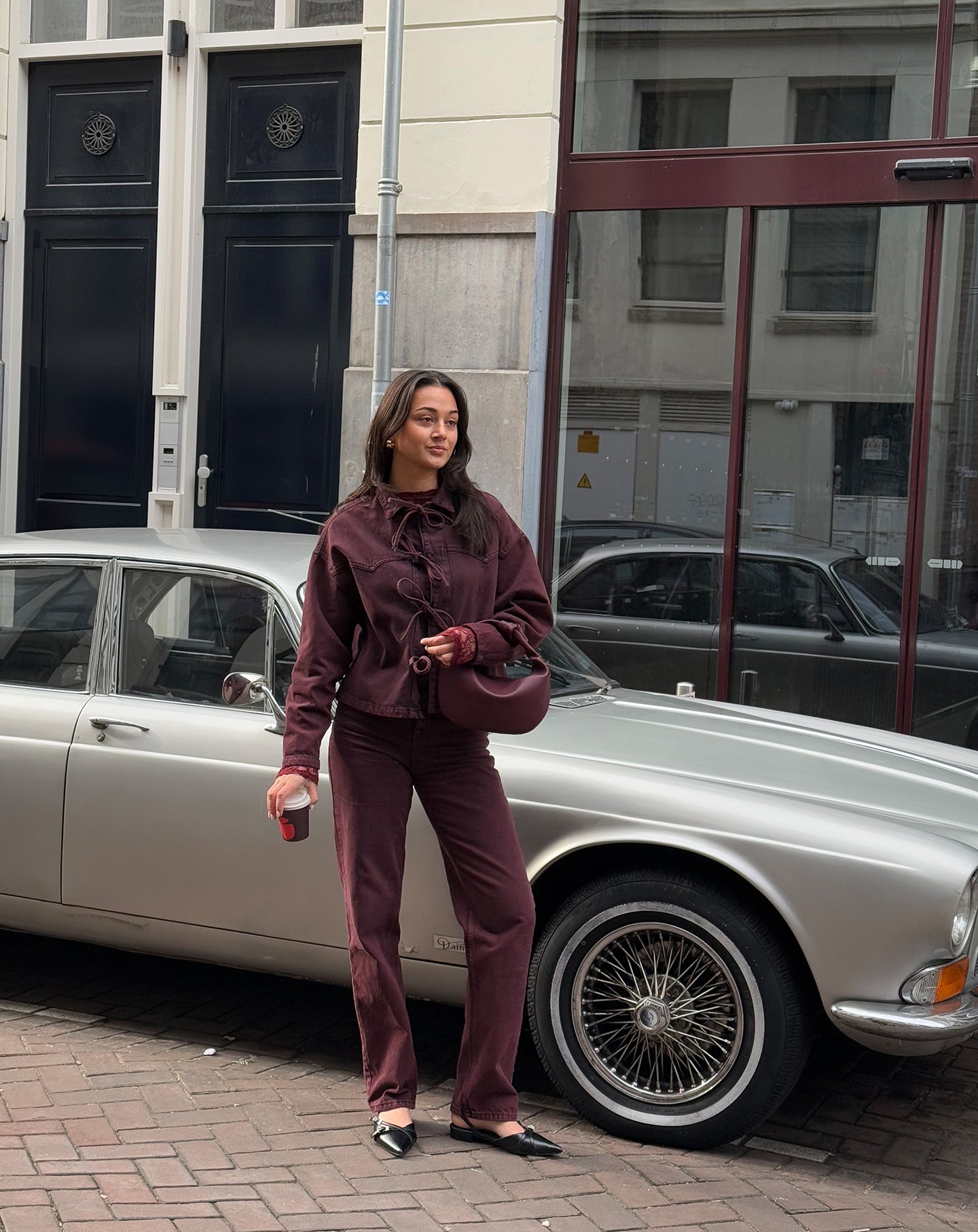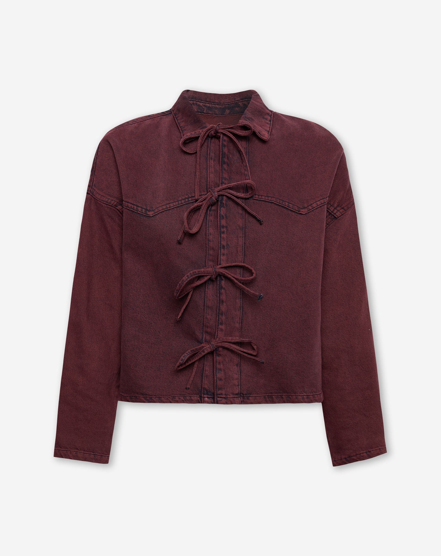 De blouse is gemaakt van burgundy-rode denim stof. De blouse heeft strikjes aan de voorkant en is de perfecte match met de bijpassende jeans of rokje.