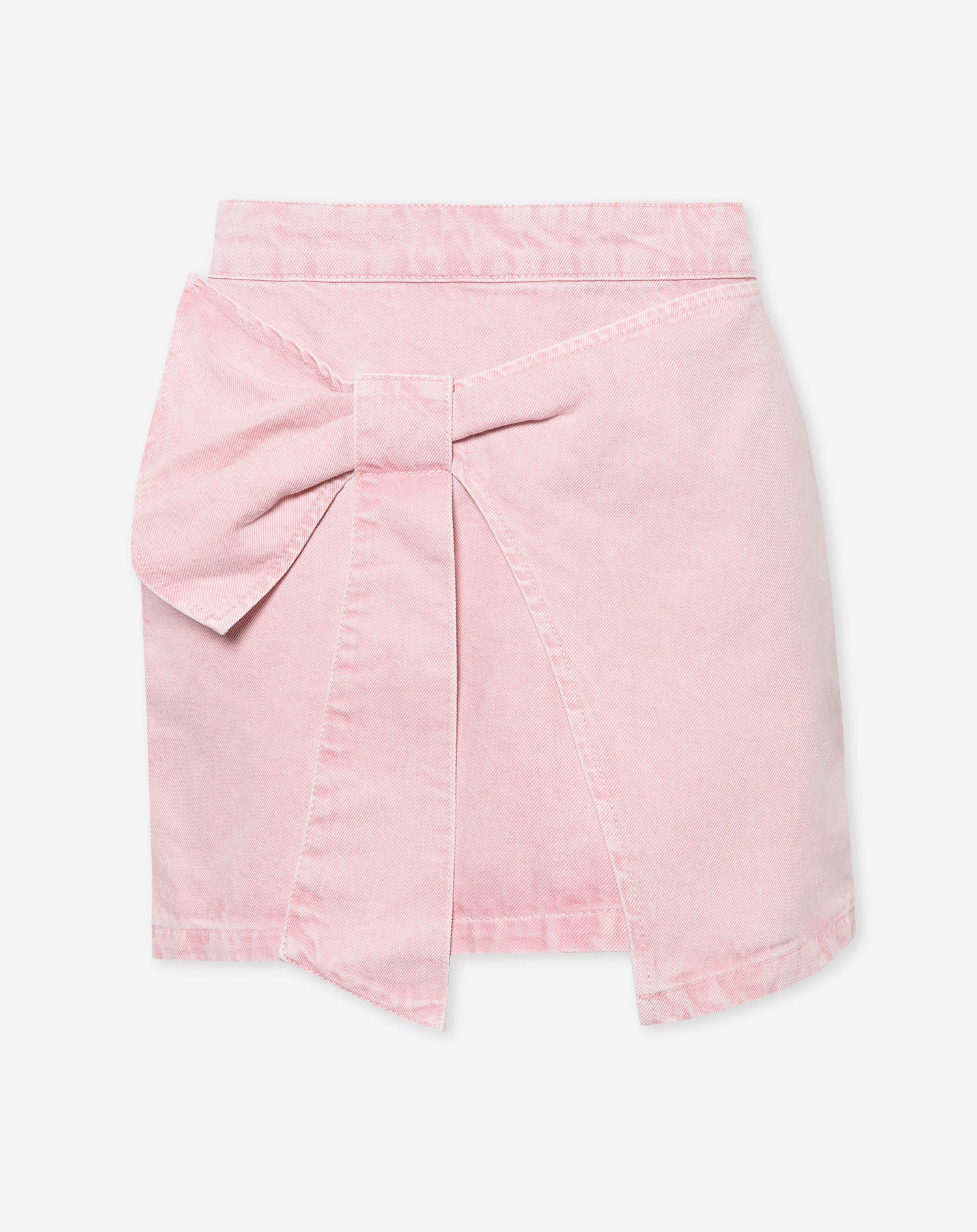 Het rokje is gemaakt van een lichtroze denim stof. Het rokje heeft een strik aan de voorkant. Het rokje heeft een ritssluiting aan de achterkant en heeft geen zakken.