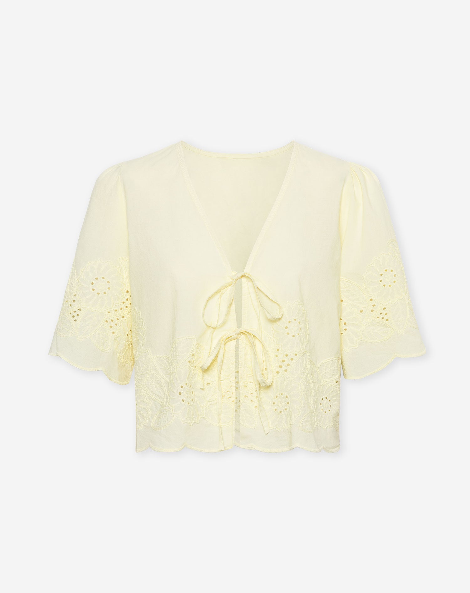 De top is gemaakt van een botergele stof. De top heeft 2 strikjes aan de voorkant waardoor deze perfect bij de bow-trend van dit moment past. De top heeft een geborduurde bloemenprint.