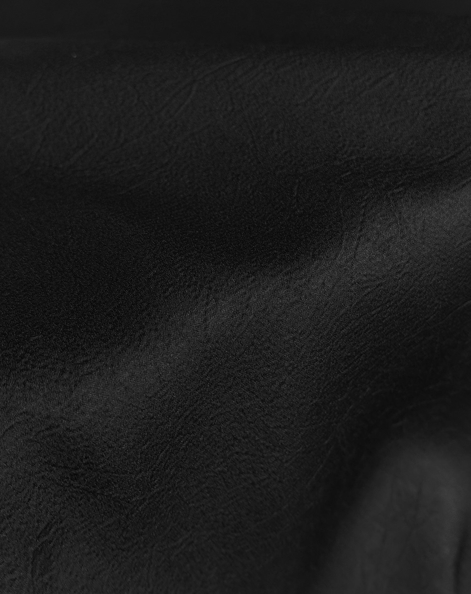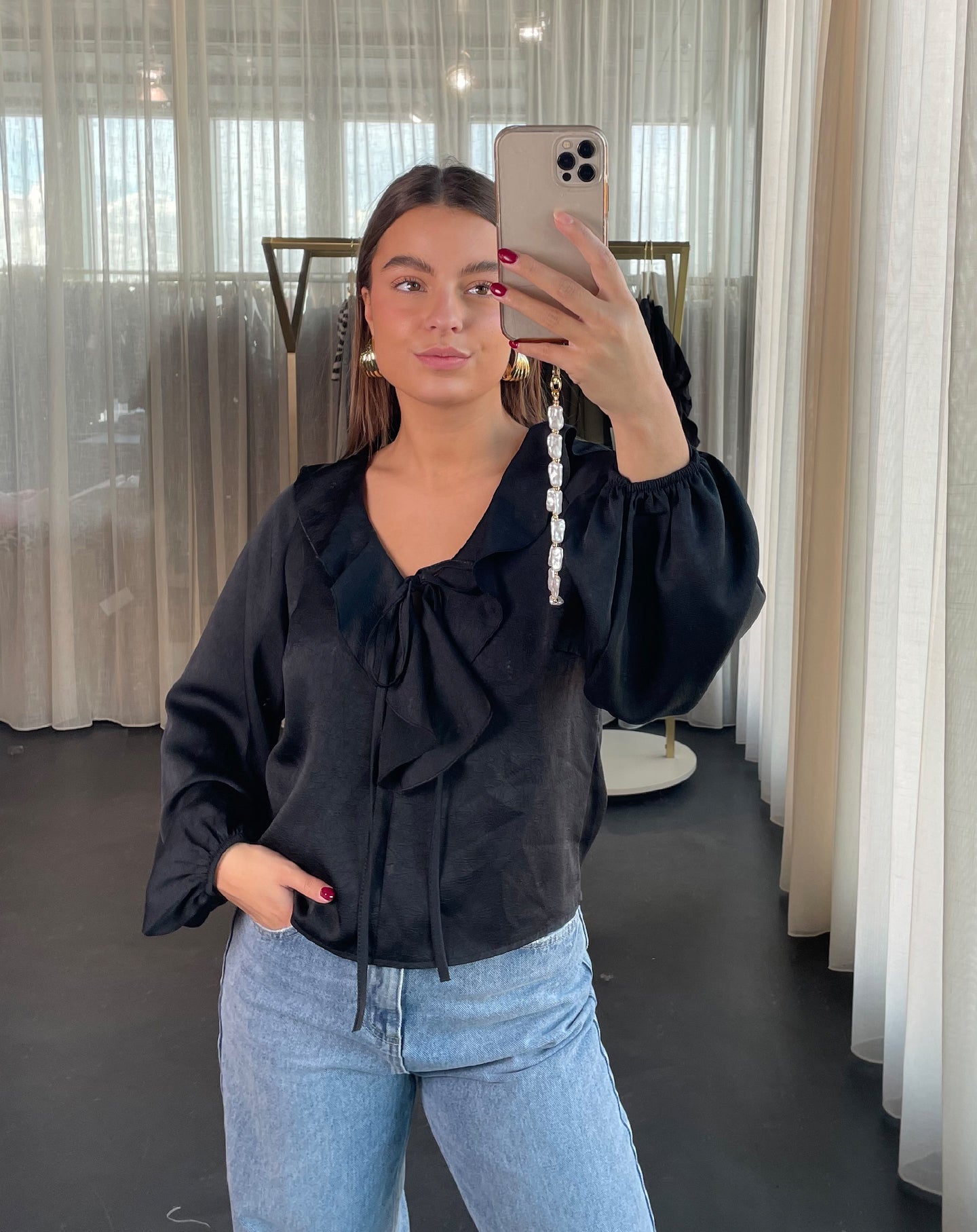 De top is gemaakt van een zwarte, licht glimmende stof en heeft een lichte crinkle structuur. De top heeft pofmouwen, ruffles en een strikje aan de voorkant.