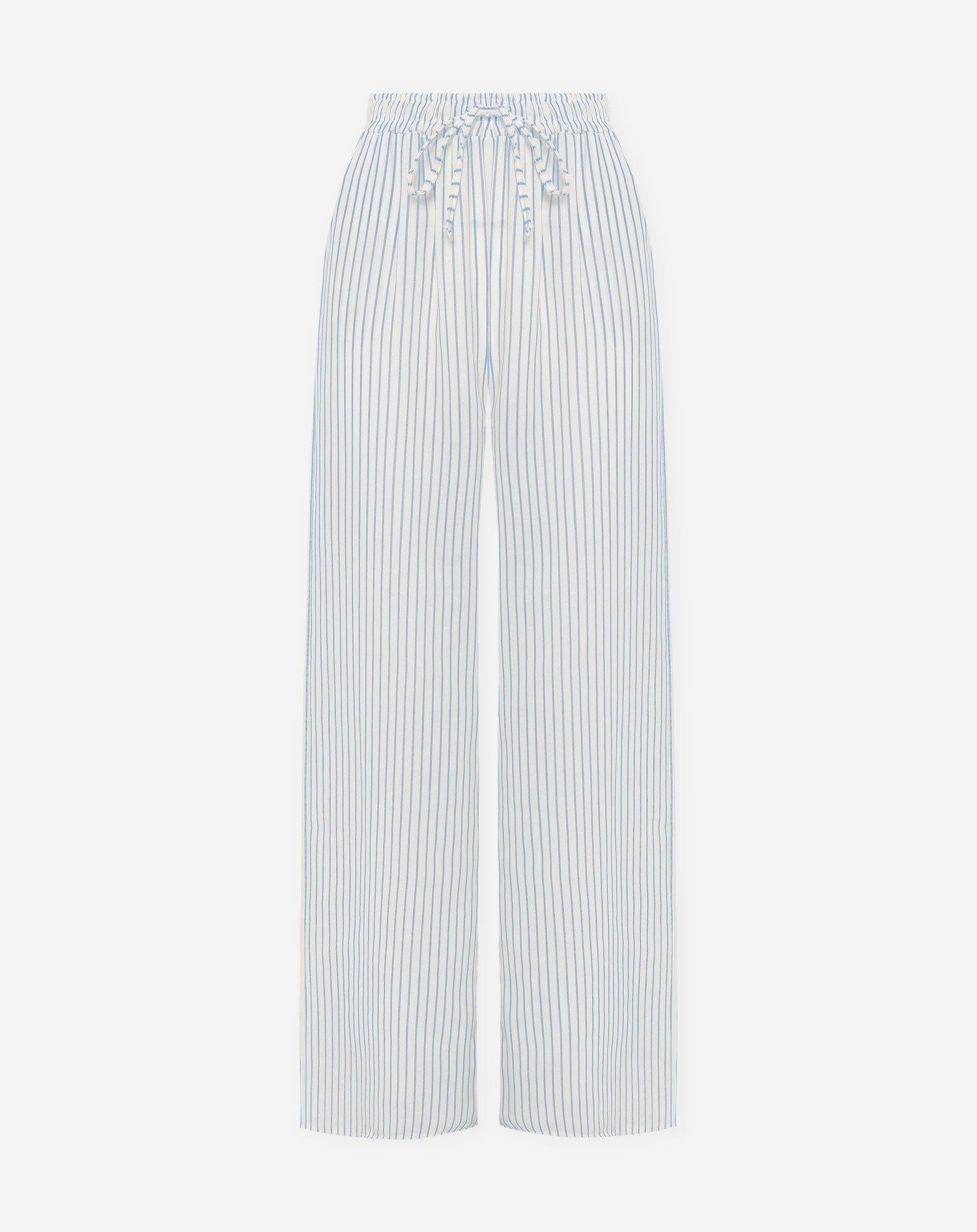 De pantalon heeft een gestreept printje en heeft een elastieken band rond het middel. De pantalon heeft zakken aan de zijkant en heeft 2 touwtjes waarmee je de pantalon strakker aan kunt trekken.