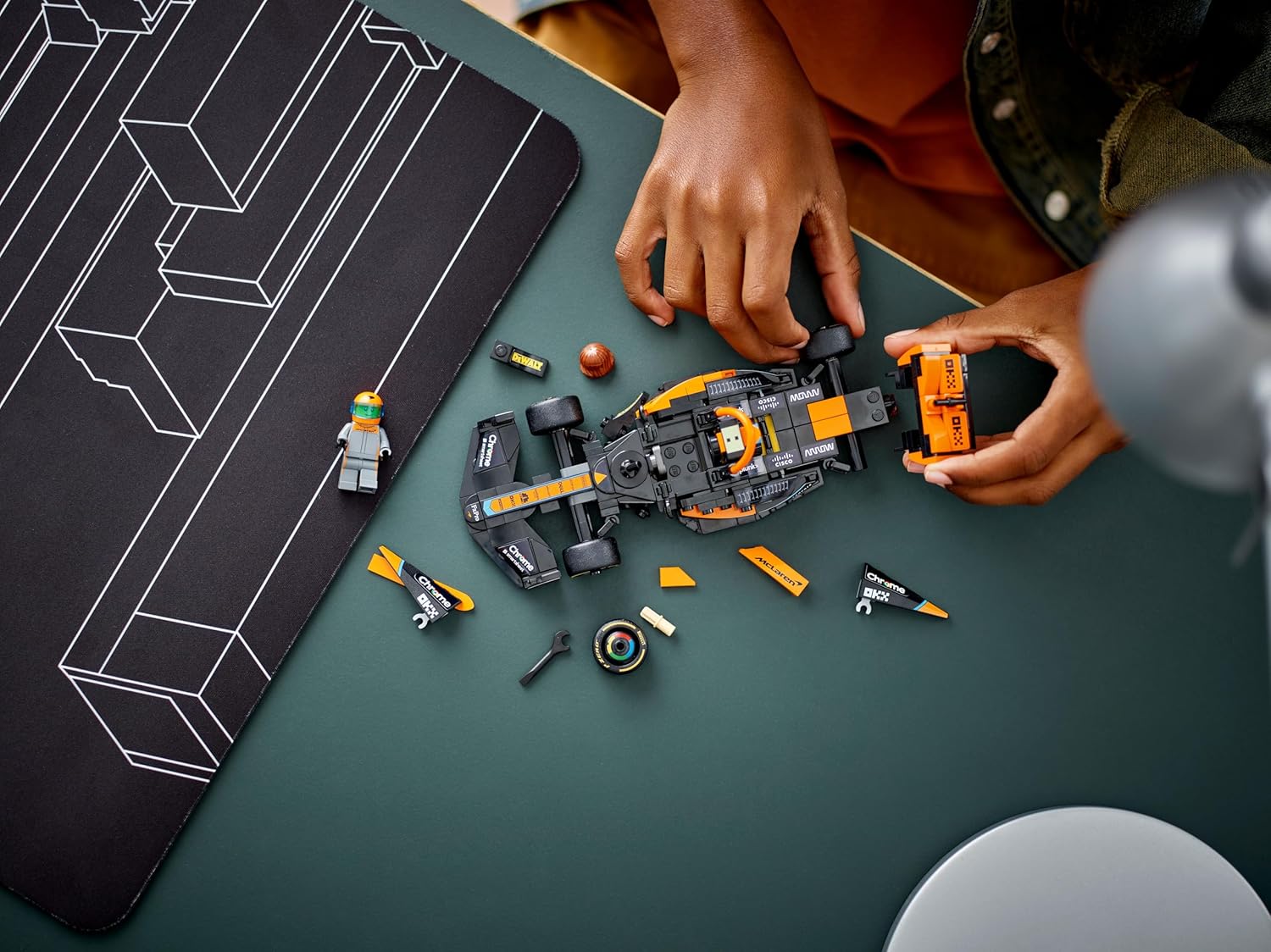 - The LEGO Speed Champion Mc Laren Formula 1 racing car 2023 features a black and orange lacquer coating, team sponsor logos, Pirelli printed tyres and orange cockpit protection