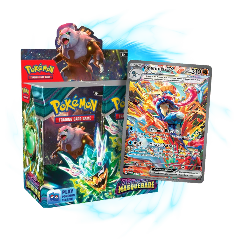 Stap binnen in het mystieke land van Kitakami, waar folklore en avontuur hand in hand gaan. In de Twilight Masquerade uitbreiding ontdek je de geheimen van de gemaskerde Legendarische Pokémon Ogerpon, die verschijnt in vier angstaanjagende Tera Pokémon ex-vormen. Vorm een team met nieuw ontdekte Pokémon zoals Bloodmoon Ursaluna ex en Sinistcha ex, en ontdek de kracht van Greninja, Dragapult en Magcargo als Tera Pokémon ex. Daarnaast introduceert deze set de krachtige ACE SPEC-kaarten, die nieuwe strategische mogelijkheden bieden